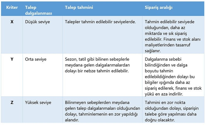 XYZ Analizi, ABC Analizi (Pareto Analizi) ‘nin devamı olarak, istatiksel verileri de hesaba katan Talep Tahmin Analizidir. Diğer bir anlatımla, dikeyde çalışan ABC Analizi ‘ne yatay yani istatistiksel boyut boyut katar.
